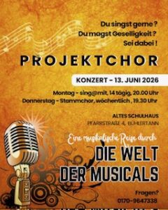 Alle Veranstaltungen „Best of Musical – …“ des Liederkranz Bühlertann 13. Juni um 20:00 - 23:00 Veranstaltung Navigation « Benfizkonzert des Chorprojekt Rosengarten Probe Projektchor CVRK » „Best of Musical – unsere Chöre in Konzert“ Zum Kalender hinzufügen Google Kalender iCalendar Outlook 365 Outlook Live Details Datum: 13. Juni Zeit: 20:00 - 23:00 Veranstalter Liederkranz Bühlertann e.V. Veranstaltungsort Altes Schulhaus Pfarrstraße 4 Bühlertann, Google Karte anzeigen